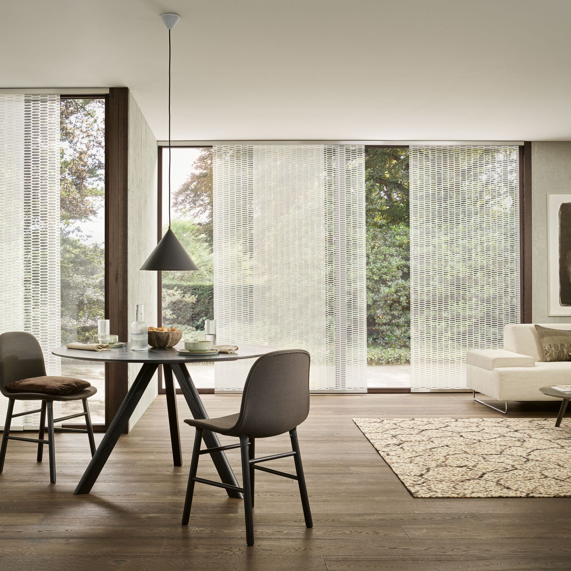 Wie sieht der Vorhang 2.0 aus? Man könnte auch sagen: Innovative Formensprache. Traditionelle Idee. Weniger ist einfach mehr beim Flächenvorhang. Denn er integriert sich perfekt in avantgardistische Architekturkonzepte, macht sich nicht wichtiger als er ist – und kann gleichzeitig als moderne Wand- und Frontgestaltung ein wichtiges Gestaltungselement mit paralleler Beschattungsfunktion darstellen. Beim Flächenvorhang werden großflächige Stoffpaneele exakt nach Ihren Wünschen gestaltet und in leichtgängigen Schienen in verschiedenen Materialien und Gestaltungsvarianten montiert. Diese Paneele lassen sich dank des Schiebesystems beliebig stufenlos seitlich verschieben und hintereinander stapeln. Ein abwechslungsreiches Spiel mit Licht, Schatten, Ein- und Ausblicken ist garantiert!